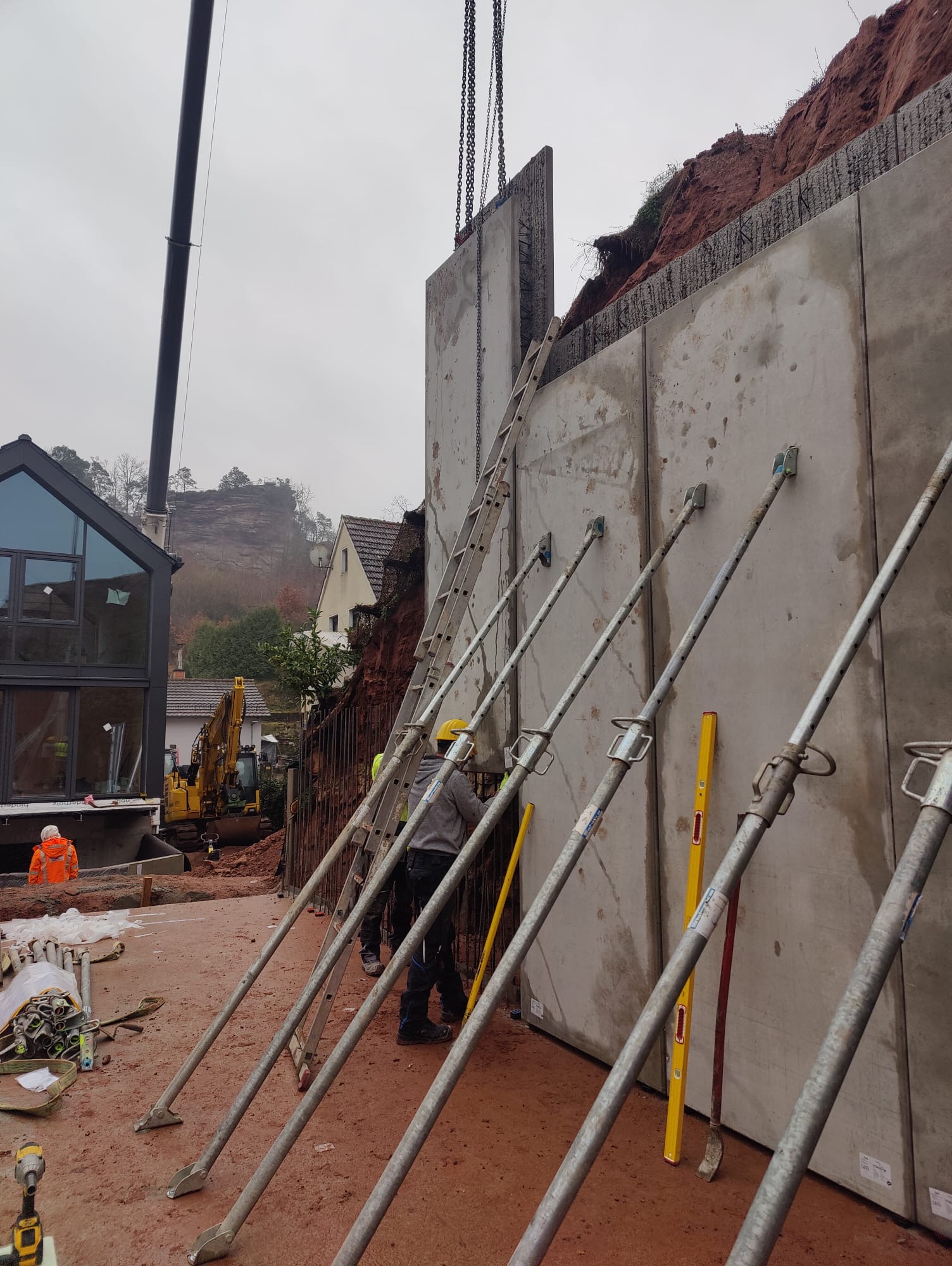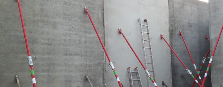 Elementwände werden per Kran versetzt und mit Montagestützen gesichert. Anschließend wird der Ortbetonkern eingebracht (bei Doppelwänden) und die Wandscheiben werden kraftschlüssig verbunden. Unser Montageteam führt diesen Schritt auf Wunsch für Sie durch.